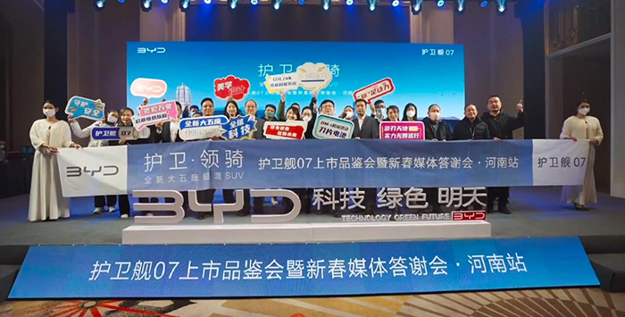 当前位置:资讯 > 比亚迪护卫舰07上市发布会及新春媒体答谢会·河南站顺利召开 1月12日,护卫舰07上市发布会及新春媒体答谢会·河南站活动在郑州银基冰雪酒店顺利举办。作为比亚迪海洋网全新大五座超混SUV的护卫舰07,综合补贴后售价20.28万元-28.98万元,实现了最高205km的纯电续航和超过1200km的综合续航,为新生代家庭用户带来“通勤可纯电、远行亦从容”的全场景出行自由。同时,家宴环节,更是互动好礼送不停。