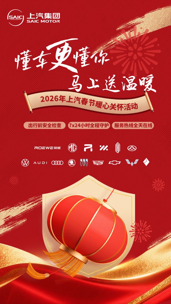 当前位置:资讯 > 懂车更懂你 马上送温暖 2026年上汽春节暖心关怀活动“守护团圆路” 2026年2月2日,春节的脚步越来越近,自驾返乡、阖家出游的计划已经提上日程。为了让广大车主开开心心出门、平平安安回家,上汽集团将正式启动“懂车更懂你 马上送温暖——2026年上汽春节暖心关怀活动”,旗下荣威、MG、智己、尚界、大通、大众、奥迪、别克、凯迪拉克、五菱、宝骏等十余个整车品牌,以及遍布全国的5000+家服务网点正温暖以待,围绕“节前安心检测、春节全时守护、节后焕新出发”三大环节,为车主奉上一站式用车服务保障,全程“守护团圆路”。